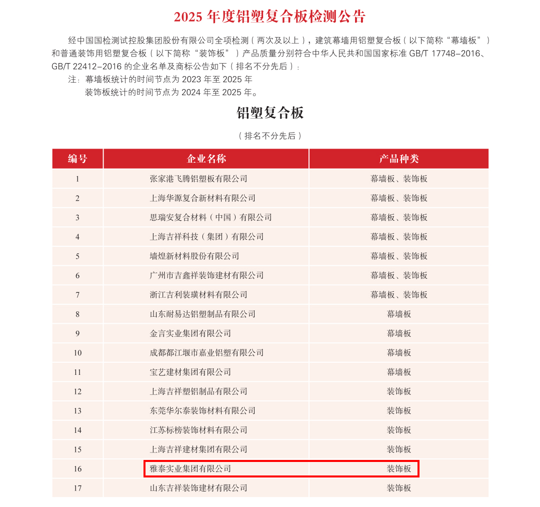 為加強(qiáng)金屬?gòu)?fù)合材料行業(yè)品質(zhì)建設(shè),提高行業(yè)整體質(zhì)量,金屬?gòu)?fù)合材料分會(huì)聯(lián)合中國(guó)國(guó)檢測(cè)試控股集團(tuán)股份有限公司對(duì)符合全項(xiàng)檢測(cè)要求的鋁塑復(fù)合板、鋁單板、建筑裝飾用不燃級(jí)金屬?gòu)?fù)合板、鋁蜂窩復(fù)合板和鋁波紋芯復(fù)合鋁板等生產(chǎn)企業(yè)頒發(fā)2025 年度產(chǎn)品合格證,具體公告如下: