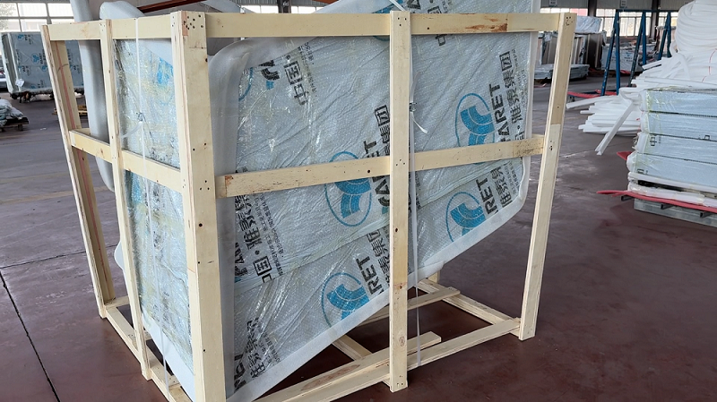 成品褶皺板經(jīng)檢驗(yàn)合格后,分別用保護(hù)膜,外附加一層氣泡膜進(jìn)行包裝防護(hù)。裝運(yùn)時釘制專用木箱進(jìn)行外圍運(yùn)輸防護(hù)。