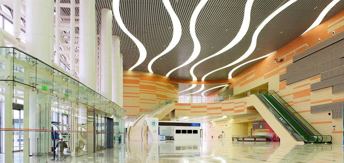新疆克拉瑪依會展中心,1期(20,000平方米)和2期(40,000平方米)。1期會展廳可以被分隔為兩個各5,5000平方米的廳,公共大堂和廣場是室內(nèi)的,以響應(yīng)克拉瑪依寒冬氣候和盛行風(fēng)。1期的主大堂特意被做成超大尺寸以允許舉辦額外的超大展覽或?yàn)榱藵M足多個展覽的登記工作;1期大堂也通過人行天橋與2期連接。一個能夠容納超過300人的會議區(qū)域被置于大堂的上一層。